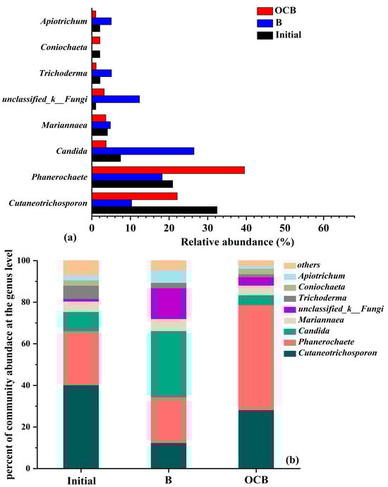 Analysis of significant differences in fungal community changes (a) and changes at genus-level diversity (b) before and after B and OCB system degradation.