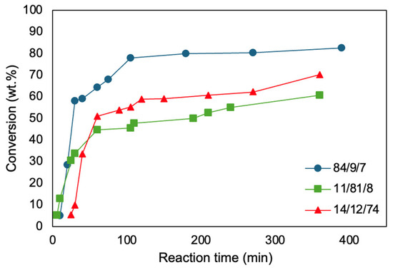 Conversion versus time for bulk BA/MDO/VAc terpolymerization at various feed compositions (BA/MDO/VAc (mol%/mol%/mol%) 84/9/7 (circles), 11/81/8 (squares), 14/12/74 (triangles)).