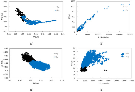 The average values of the AE parameters in relation to the loading stress σy for 0° and 45° loading, and in relation to τxy for 90° loading, are shown on Figure 9. Abscissa values are the mean values of a 30 MPa large stress interval. Acquired AE signals during an early damage state, in the case of the predominant tensile mode of loading, exhibit higher AF values and lower RA values. With the increase towards final failure, the AF decreases and RA increases. However, different parameter changes can be observed with pure shear loading. AF increases as final failure approaches, which can relate to fiber rotation and the occurrence of tensile cracks in the specimen, while RA values do not show a pronounced trend of increasing as final failure approaches. Shear type cracks with pure shear leads to higher RT values, as expected compared to increased tensile loading connected with tensile mode cracks. Similarly, RA is higher in the case of 45° and 0° loading, while AF is lower than that of tensile loading. The increase in the E with increased stresses can be linked with the emergence of delamination and fiber breaks in a laminate. The value of RT is higher in the early loading phase in simple shear than in the case of pure tensile loading, while, with increasing load towards peak force Fp, RT values increase significantly in loading cases where the tensile stress is higher, and becomes much higher than in shear loading.