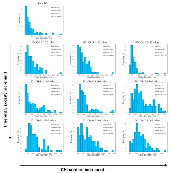 Histograms depicting the fiber diameter distributions of fabricated PCL and PCL/CHI biomaterials. Arrows denote directions in the increment of CHI content (from 10 to 30%) and CHI inherent viscosities (from 20 to 100 and 600 mPa·s) within the fibers.