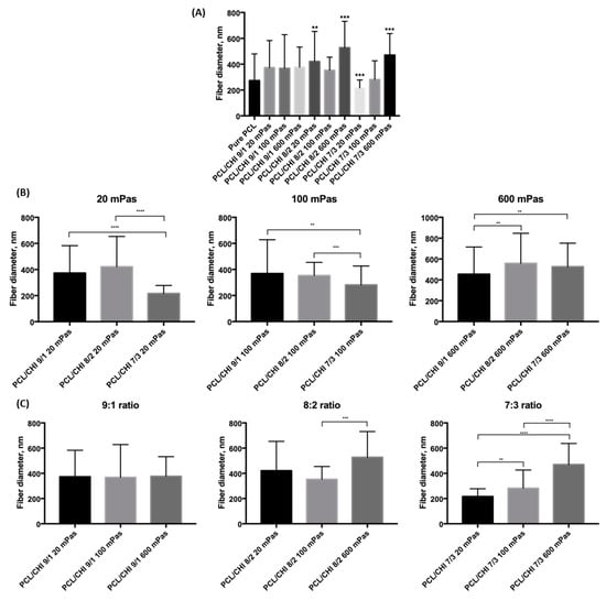 Results of multiple-comparison test of fabricated PCL and PCL/CHI biomaterials (A) in general, (B) for different CHI inherent viscosities (20, 100 and 600 mPa·s) and (C) for different PCL:CHI ratios (9:1, 8:2 and 7:3). (A) Asterisks denote statistically significant differences in the fiber diameter distributions compared to the distribution of pure PCL. Other asterisks denote statistically significant differences in the fiber diameter distribution within (B) viscosities or (C) PCL:CHI ratios with p < 0.05 significance level.