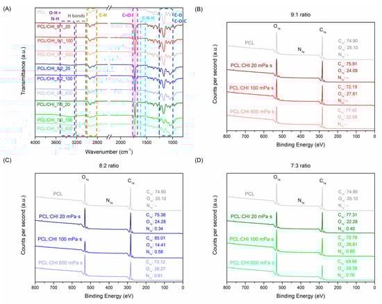 (A) FTIR spectra and XPS diagrams at (B) 9:1, (C) 8:2 and (D) 7:3 PCL:CHI weight ratios of PCL and PCL/CHI nanofibers.