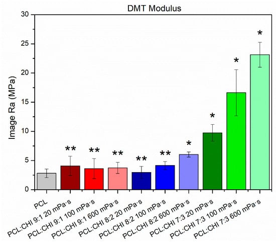 Nanomechanical properties (Young’s modulus, DMT model) of synthesized PCL and PCL/CHI nanofibers. ** Non-significant differences (p > 0.05); * significant differences (p < 0.05).