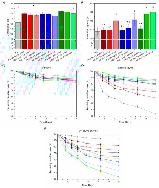 (A) Contact angle values; (B) absorption capacity (%); and (C) hydrolytic (PBS alone), (D) lipase enzymatic and (E) lysozyme enzymatic degradation profiles of electrospun PCL and PCL/CHI nanofibers. ** Non-significant differences (p > 0.05); * significant differences (p < 0.05).