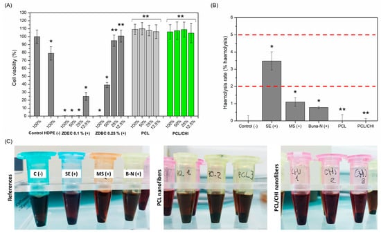Therefore, biological safety of nanofiber-based dressings was first assessed by a cytotoxicity test (Figure 7A) according to the ISO 10993-5:2009 norm [36]. In this standard, it is stated that cell viability values below 70% are considered cytotoxic. In Figure 7A, it can be observed that cell viabilities of cytotoxic ZDEC positive controls (+) are inversely proportional to the extract concentration, whereas the non-cytotoxic HDPE negative control (−) displays a cell viability of 79.01 ± 8.42% (p < 0.05, blank cell viability: 100.00 ± 8.34%). What is more, both PCL and PCL/CHI nanofibers exhibited an adequate cytocompatibility with cell viabilities of 109.25 ± 6.43% for PCL and 106.07 ± 9.05% for PCL/CHI_7/3_100 at 100% concentration.