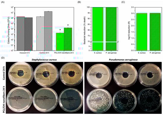 where A is the average of viable cells (CFU) after contact time with PCL/CHI nanofibers, and B is the number of average viable cells (CFU) in control samples after 24 h of contact time. The control corresponds to S. aureus or P. aeruginosa suspensions in the absence of tested product.