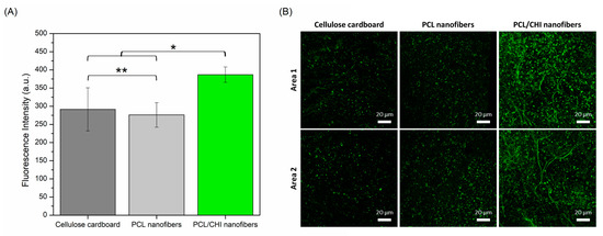 (A) Quantitative total fluorescence intensity (a. u.) calculated by ImageJ software obtained from (B) fluorescence images obtained by CLSM of cellulose cardboard, PCL nanofibers and PCL/CHI nanofibers after 48 h (2.5× magnification, 20 µm scale bar). Areas 1 and 2 are two representative randomly taken microphotographs of its well. ** Non-significant differences (p > 0.05); * significant differences (p < 0.05).