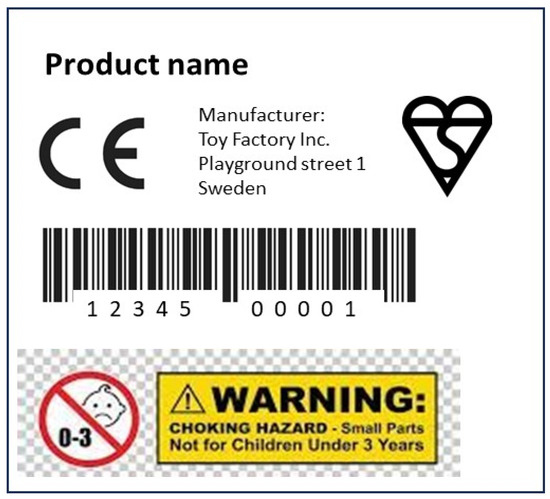 A traceability system is also applied on toys for the EU, where all toys must comply with the TSD and must carry a CE mark. This mark is an indication that the toy meets the safety requirements. The directive sets out the labelling requirements for general toy products, including plastic toys. In addition to the CE mark, the required labelling information includes product traceability information (e.g., the manufacturer’s location and contact information, batch ID, model number and date of production) as well as all relevant details related to the sourcing of the product, or the raw material used in making the product. Figure 3 below illustrates a typical label on a toy.