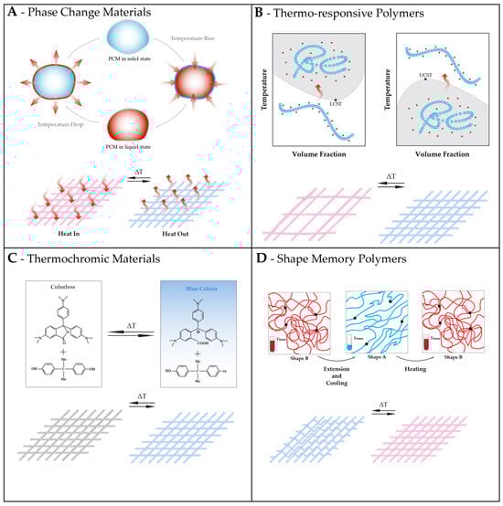 This adaptability in fibrous structures can be achieved through the incorporation of materials that can sense temperature changes, materials capable of absorbing and/or releasing heat and materials that sense temperature changes and adjust fabric insulation by modifying breathability and moisture management [48]. Some examples of those materials include phase change materials (PCMs), shape memory materials (SMMs), temperature-responsive polymers, and thermochromic materials (TCMs), as seen in Figure 1.