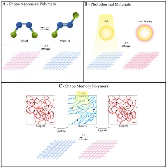 Photo-responsive polymers can be broadly categorized into photochemical or photothermal polymers [83]. The photochemical effect involves light-induced moieties’ reactions, such as isomerization and dimerization [83]. Azobenzenes, especially, undergo trans-cis isomerization under UV light and cis-trans isomerization under visible light [83]. Photochromic polymers, which undergo changes in color upon exposure to light, are included in the photochemical category. Photothermal polymers can convert light into heat [83]. Examples include polydopamine, polypyrrole, and polyaniline [83].