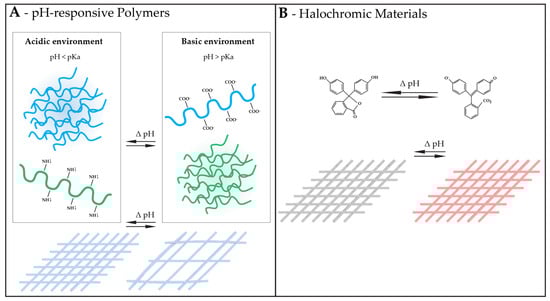 The significance of pH responsiveness in fibrous structures lies in its capacity to impart dynamic functionalities. Fabrics adjusting properties like color [133], wettability, or porosity [47] based on surrounding pH improve user experience. From health care applications like wound care and drug delivery to addressing environmental concerns through efficient oil–water separation and responsive filtration, the relevance of pH responsiveness extends to optimizing performance and functionality in various contexts [40,134,135,136]. To impart fibrous structures with pH responsiveness, pH-responsive polymers or halochromic materials, for example, can be employed (Figure 3).