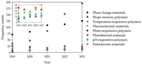 Approximate frequency counts, within published literature of the last five years (2019–2023) of the usage, in fibrous structures, of different responsive materials, namely: phase change materials, shape memory polymers, temperature-responsive polymers, thermochromic materials, photo-responsive polymers, photothermal materials, pH-responsive polymers and halochromic materials (database: Scopus).