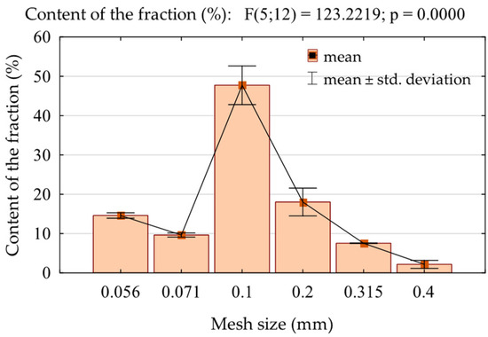 The buckwheat husk was ground using an IKA A10 basic laboratory mill (Staufen, Germany). To assess the particle size distribution, the obtained powder was passed through a set of sieves with the following mesh sizes: 0.056, 0.071, 0.100, 0.200, 0.315 and 0.400 mm. The determination of the fractional composition was repeated 3 times, and the average results are presented in Figure 1. Only fractions 0.2 mm and smaller were collected and used in this research. Then, the obtained powder was dried at 50 °C to reach a moisture content (MC) of 3 ± 1%.