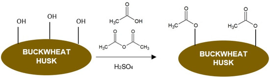The first method of buckwheat husk modification was acetylation. This was performed by using the conditions described by Włoch and Landowska [27]. For this purpose, 50 g of husk powder was soaked in the mixture containing 2 mL of concentrated sulphuric acid, 198 mL of acetic acid and 200 mL of acetic anhydride. The modification was carried out for 48 h at room temperature while stirring at 400 rpm. The acetylated powder was washed with distilled water until neutral pH was reached and dried at 50 °C for 72 h. The schematic presentation of the performed acetylation is shown in Figure 2.
