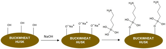 The second method had two steps. The aim of the first step, which was mercerization in NaOH solution, was to activate the surface and increase the availability of hydroxyl groups. It was performed following the procedure described by Vázquez-Fletes et al. [29]. For this purpose, 50 g of ground husk was soaked in 500 mL of 5% NaOH solution at room temperature for 10 min while stirring at 400 rpm. Then, the suspension was filtered, washed with distilled water until neutral pH was obtained and dried at 80 °C for 12 h. The second step was silanization with 3-aminopropyltriethoxysilane (APTES) using the method described by Woźniak and Ratajczak [31] with a slight modification. The concentration of APTES in the solvent (a mixture of ethanol and water in a mass ratio of 80:20) was 20%. The mixture was stirred for 30 min and then the ground husk particles were soaked in the solution in a 1:5 mass ratio. The pH of the solution was decreased to 4 with acetic acid to increase the silanization effectiveness [32]. The reaction was run at room temperature for 3 h while stirring at 400 rpm. Then, the suspension was filtered, washed with distilled water to reach a neutral pH and dried at 50 °C for 48 h. The schematic presentation of the performed silanization is shown in Figure 3.