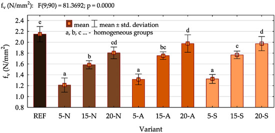 The results of the bonding quality determined in the wet shear strength test (fv), which is considered to be the basic indicator of the adhesive behaviour in plywood, are presented in Figure 5. Based on the outcomes, it was found that the reference plywood was characterized by the highest strength of the bond lines. The progressing gelatinization of flour at high temperature during pressing leads to the creation of a cross-linked structure, providing high homogeneity of the cured adhesive. In the case of biomass particles, it may be difficult to achieve, especially considering the tendency of fine particles to agglomerate. According to Gao et al. [50], the formation of agglomerates may lead to the deterioration of the morphology of the cured resin by the formation of microcracks and void spaces. Moreover, their formation also hinders the transfer of stresses in the bond line by concentrating them at certain points [51]. Markedly, it was also noticed that as the loading of the buckwheat husk increased, the shear strength values also increased. The reason was most likely the adjustment of the viscosity, which prevented the resin from penetrating the veneer, and consequently, the amount remaining on the veneer surface allowed for the creation of a bond line characterized by good quality [6]. Furthermore, the analysis of the homogeneous groups showed that the filler modification resulted in considerably less noticeable changes. No significant effect of filler acetylation was observed. However, it seems that the silanization contributed to the improvement in the bonding quality. The comparison of the variants containing 15% of the ground husk showed a 10% increase in strength as a result of the husk’s modification with APTES. This positive effect was most likely caused by the increased reactivity of the adhesive, improved compatibilization between the adhesive and filler and better dispersion of the filler within the adhesive. The enhancement in UF resin performance due to the filler modification using APTES was also noticed in the case of research on, for example, ground needles [12], nanocellulose [52] and nanoclay [53].