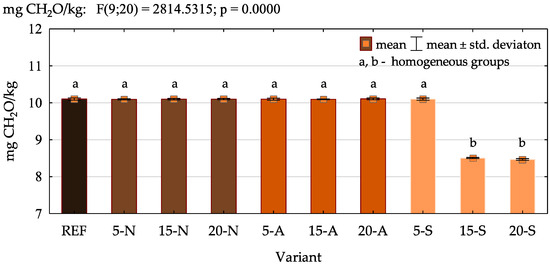 Considering that the long-term exposure to indoor formaldehyde release can pose a high risk to human health, the limits of permissible emissions are constantly becoming more stringent. Therefore, it is important to find fillers that will allow for the production of plywood characterized by a lower formaldehyde release [58,59]. The results of formaldehyde emission are shown in Figure 6. Although buckwheat husk contains bioactive compounds such as phenolic acids and flavonoids, no statistically significant changes were observed when non-modified or acetylated husks were used, regardless of their amount. The only significant differences were noticed in the case of the variants containing 15 and 20% of the silanized husk. In their case, the amount of released formaldehyde was reduced by approx. 16%. The reason was probably the amino group located on top of the APTES molecule. According to Hassannejad et al. [60], it is the most effective reactive group for formaldehyde adsorption, and therefore, it can react with both free and hydrolyzed formaldehyde in UF resin-bonded plywood [61].