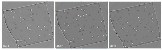 The sizes of visible clusters measured in X-ray images vary in the range of 20–30 µm. In a single slice, the clusters of different sizes are imaged depending on their position with regard to the slice plane. The average distances between the pores depend on the concentration of reinforcing particles. Here, in the slice of thickness 0.35 µm for the concentration 0.25 wt.% of CNTs, the average density of the carbon clusters encapsulated with air is 120 items/mm2. In Figure 2, a set of successive slices located at a distance of 10 µm from each other demonstrates the pore configuration dynamics as one moves through the depth of the specimen.