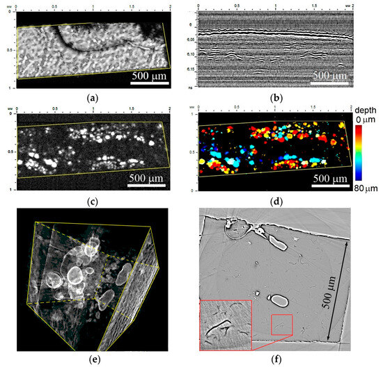 Internal microstructure of epoxy–GNP nanocomposite: (a)—acoustic image of surface, (b)—B-scan in the central part, (c)—C-scan at depth of 40 µm and thickness of 44 µm in classic gray scale gradation and (d)—a color distribution of agglomerations over the depth. Working frequency is 200 MHz, scanning field is 1 × 2 mm, scanning step is 5 µm. (e,f)—Three-dimensional rendering and a slice of the sample obtained by X-ray tomography at the PETRA III synchrotron.