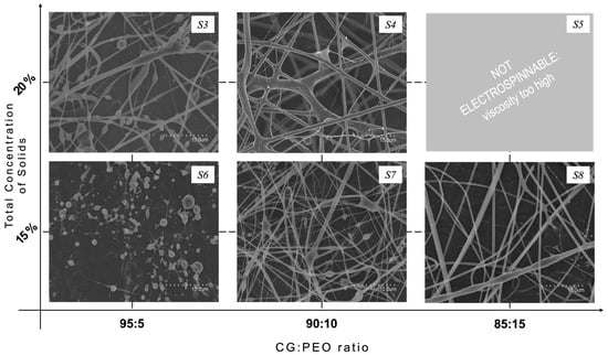 Additionally, a lower total solid concentration of 15% w/v was explored, with CG:PEO5M ratios of 95:5, 90:10, and 85:15, respectively, being identified as solutions S6, S7 and S8. Solution S6 did not result in the production of fibers, as can be observed from Figure 2, and only particles were produced. Increasing the PEO5M content allowed the production of fibers but still showed some spindle-like defects, and wet fibers were also collected. The CG:PEO5M ratio of 85:15 (Solution S8), on the contrary, allowed the formation of smooth fibers that were almost defect-free, as shown in Figure 2. The average diameter of these fibers was 0.9 ± 0.2 μm.
