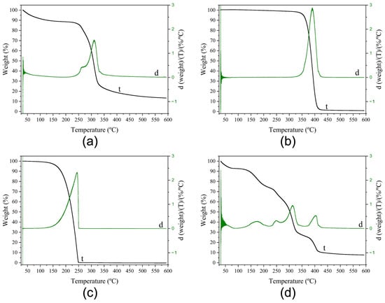The thermogram of the neat glycerol (Figure 6c) was also determined, in which one main weight loss step of 100% was observed, exhibiting a Tdeg of 244 °C, which is in accordance with previously published results [].