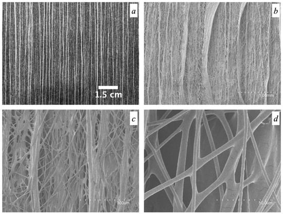 Figure 7 shows an optical picture of the fiber mat (Figure 7a) and the micrographs of the obtained fibers for sample S12, after processing using the high-throughput electrospinning setup with a five-needle injector (Figure 7b–d being micrographs of the same sample taken at different magnifications). The production yield increased from the 3.4 g/h generated in the single-emitter setup to 38.1 g/h in the high-throughput setup. As can be clearly appreciated in Figure 7a,b, the electrospun fibers generated were surprisingly aligned, even though the drum collector speed was very low with respect to yield fiber arrangement per se []. More interestingly, the fibers produced here bundled together while flying to the collector in the form of oriented yarns with numerous lateral thinner fiber inter-connections. To the best of our knowledge, this unexpected morphology has never been described before. This attained morphology occurred spontaneously and was not achieved by means of any fiber deposition control systems, such as additional electrostatic fields different from the one required for the jet initiation [,], high drum collector rotation speeds to suppress the whipping motion [,,], jet-deflecting electrodes [], or electrostatic lens as implemented by Deitzel et al. []. The resulting smooth fibers showed a bimodal distribution of sizes in which bundles of oriented fibers and lateral thinner interconnecting fibers are clearly visible, as already mentioned. The bundled fibers exhibited an average diameter of 45.4 ± 14.9 μm, while the lateral interconnecting fibers presented an average diameter of 4.1 ± 2.2 μm. A bimodal distribution of diameters was also reported previously by Urbanek et al. [], who developed polycaprolactone/chitosan electrospun fibers using a drum collector rotating at 350 rpm, even though no orientation of fibers was observed.
