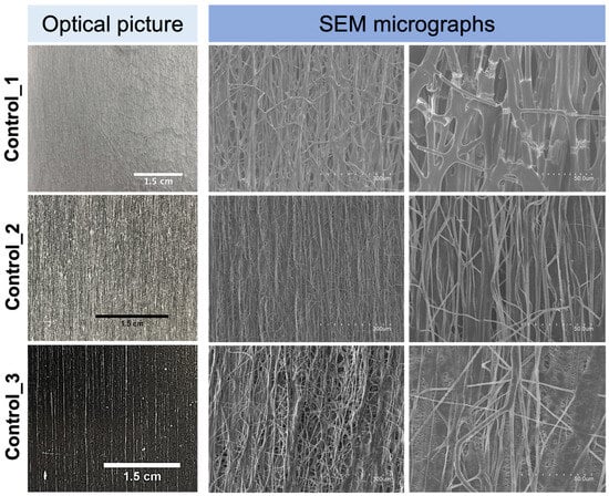 Photographs showing the naked-eye appearance and SEM micrographs of the multi-jet electrospun fiber mats from Control_1, Control_2, and Control_3.