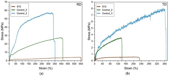Typical tensile stress–strain curves of fibers from S12, Control_2, and Control_3. Both drum rolling direction (a) and transversal direction (b) are shown.