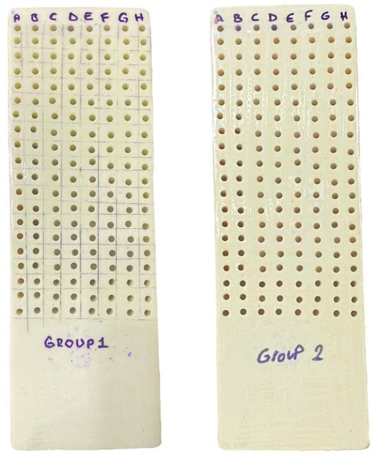This single-blind in vitro study was conducted at the Department of Oral and Maxillofacial Surgery, Faculty of Dentistry, Van Yüzüncü Yıl University in March 2024. Two 25 × 15 × 2.5 cm3 PU plates (PURYAP Construction Chemicals and Machinery Industry Trade. Co., Ltd., İstanbul, Turkey) with a density of 50 per cubic foot (pcf) were prepared for the study to be used as a dense D1 bone model in vitro. The literature suggests that the density of PU corresponding to D1 bone is 30–40 pcf and that corresponding to cortical bone is 50 pcf [33,34], so in this study, we chose to use single-layer 50 pcf PU plates to create a dense D1 bone model. The plates were coded by the assistants with the numbers 1 and 2 and the letters a, b, c, d, e, f, g and h to blind the author surgeon who would perform the implantation, and only the assistants knew which letter and number belonged to which group. The preparation of the implant sockets in the plates was performed according to a protocol established by an independent surgeon outside the study. Implantation in the groups was performed by the same author surgeon. A 3.75 × 10 mm2 dental implant (MarsTM, Medigma Biomedical GmbH, Wehingen, Germany) was used in the study. The implant placement condition and the insertion and RTs of the implants in the groups were measured and recorded. Based on the results of a previous study, the sample size was determined with an alpha error of 0.05, an effect size of 0.45 and a power (1-beta) of 0.80. A minimum sample size of 10 implant sockets was calculated for each subgroup [35].