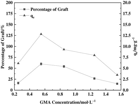 Effect of GMA concentration on percentage of graft and adsorption amount of corresponding adsorbent (40 °C, 0.03 g SDBS and the grafting time of 8 h).