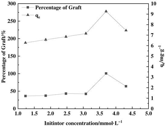 The correlation between the percentage of graft and initiator concentration is shown in Figure 4. The percentage of graft increased gradually as the concentration of the initiator increased, reaching its highest value at an initiator concentration of 3.75 mmol·L−1. The increase in adsorption capacity with increased initial concentration is attributed to the augmentation of the driving force that facilitates the transfer of the adsorbate from the solution to the surface of the adsorbent materials []. The presence of thiol hydrogen atoms on the surface of feathers enhances the transfer induction effect, resulting in a higher formation of sulfur-free radicals on the feather surface. Consequently, this accelerates the polymerization rate and increases the percentage of graft. However, a high concentration of initiators has an adverse impact on the rate of polymerization, which may be due to the elevated concentration of sulfur-free radicals produced on the feather surface. This not only increases the speed of the polymerization reaction but also accelerates the reaction rate of the monomer self-polymerization [,]. The competition between these two reactions results in a decline in the percentage of graft.