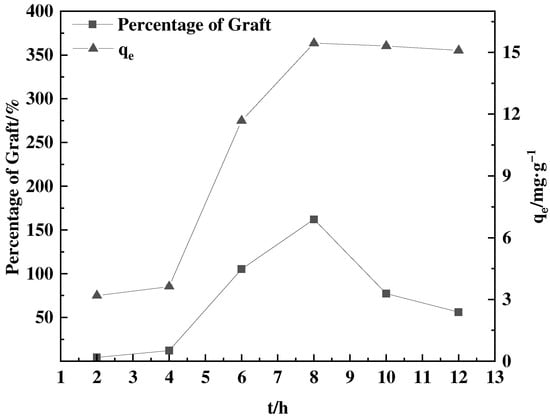 Effect of grafting time on percentage of graft and adsorption amount of corresponding adsorbent (0.55 mol·L−1 GMA, 40 °C and 0.03 g SDBS).