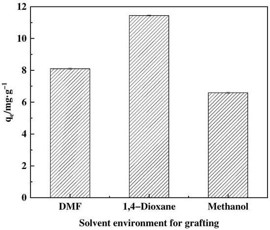 The use of organic solvents in ring-opening processes leads to improved outcomes, mainly by addressing the challenge of NMDG mass transfer issues []. To examine the impact of various organic solvents and reaction time, three different types of solvents and several time intervals were chosen for experimentation. This study evaluates the effectiveness of grafting conditions by analyzing the adsorption capacity of the adsorbent produced using these settings. Figure 6 shows the effect of different solvents on the ring opening amination reaction, while Figure 7 demonstrates that adsorption capacity enhances as time progresses. The experimental data reveal that the maximum solvent adsorption capacity is achieved by using a mixture of 1,4-dioxane and water as solvents, reaching its maximum at 8 h. After this, the percentage of graft experienced a slight decline.