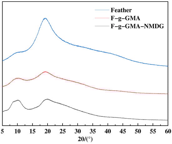 The XRD patterns of feather, F-g-GMA and F-g-GMA-NMDG.