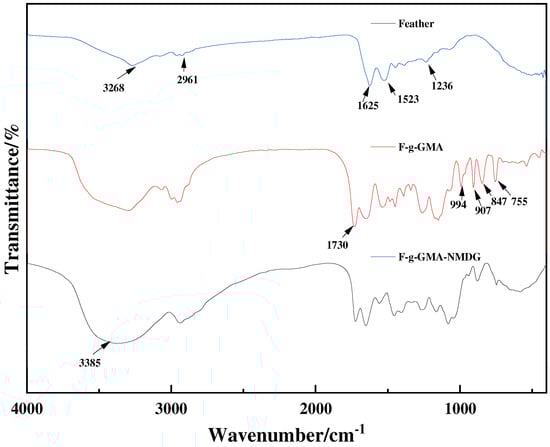 Figure 10 presents the FTIR spectra of feather, F-g-GMA and F-g-GMA-NMDG in the range of 500–4000 cm−1. The distinctive absorption peaks at 3268, 2961, 1625, 1523, and 1236 cm−1 correspond to the stretching vibration of −OH, C−H, C=O, N−H, and C−N, respectively [].