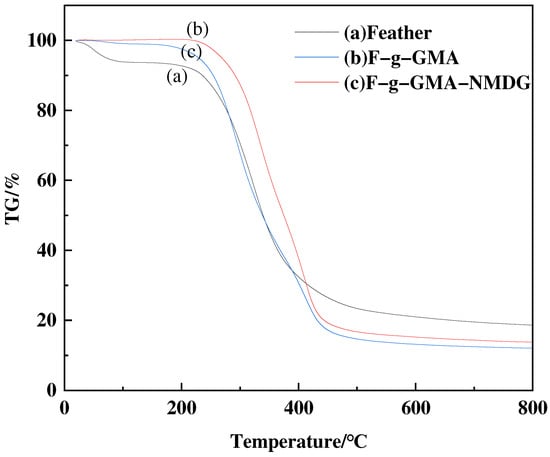 The TGA pattern of feather, F-g-GMA and F-g-GMA-NMDG.