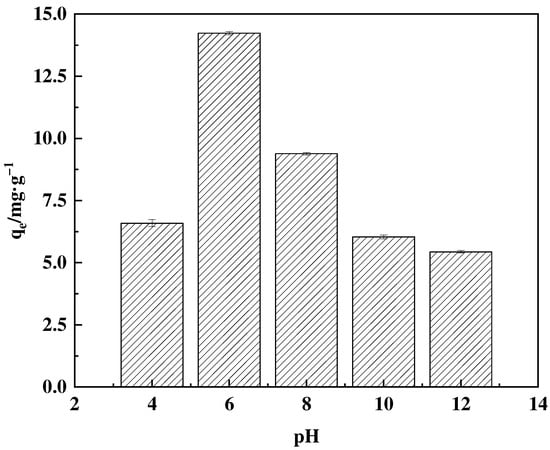 Boron exists in various ionic forms when dissolved in water. It primarily exists as B(OH)3 at lower pH levels and as B(OH)4− at higher pH levels []. These two forms can interconvert within a solution. The initial solution configuration is chemically neutral, with a pH of approximately 6. Therefore, the adsorption capacity was investigated across the pH range of 4–12, as shown in Figure 12. At a pH of 4, the adsorbent demonstrates significantly diminished adsorption efficiency. As the pH level increases to 4–6, the predominant form of boron in the solution shifts to B(OH)4−, which easily forms a stable complex with an o-dihydroxyl group, leading to a steady increase in adsorption. As the pH rises, the majority of boron in the solution exists in the form of B(OH)4− ions. The anionic functional groups in the adsorbent experience electrostatic repulsion with the borate ions, resulting in decreased adsorption [].