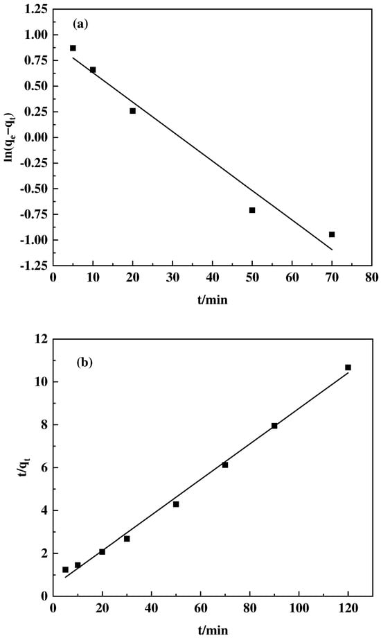 where qt (mg·g−1) signifies the adsorption amount at time t, qe (mg·g−1) denotes the amount of adsorption at equilibrium, k1 is the rate constant of the pseudo-first-order kinetic model, and k2 is the rate constant for the pseudo-second-order kinetic model.