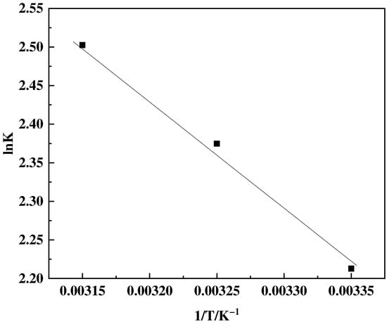 Here, K represents the equilibrium constant, which in Langmuir’s equation, may be substituted by kL. Linear fitting is accomplished using lnK and 1/T, and the enthalpy change ∆H and entropy change ∆S can be estimated using the slope and intercept. The change in free energy can then be estimated using Equation (9).