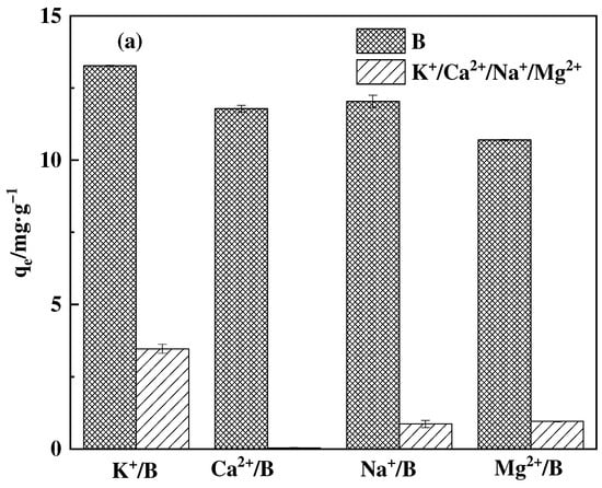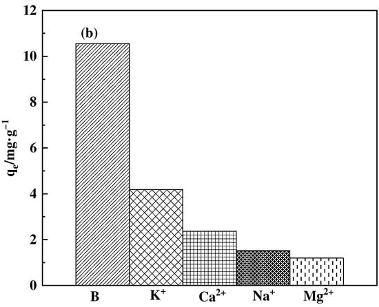 In order to investigate the adsorption capacity and selectivity of boron by adsorbents in the presence of other ions, as well as the impact of these ions on the adsorption capacity, we conducted adsorption experiments using binary and multiple systems that simulated real-world adsorption settings. The multiple system comprises ions such as Na, K, Ca, and Mg, which are found not only in industrial effluent but also in salt lake brines in larger quantities. These ions can influence the adsorption capacity of the adsorbent and it is also a factor in examining the adsorbent’s ability to adsorb target ions. The binary system can separately investigate the influence of each ion on the adsorption of boron. Binary system solutions of B/K, B/Ca, B/Na, and B/Mg were prepared, along with multicomponent system solutions of B/K, Ca, Na, and Mg. The elements involved in the configurations were B, K, Ca, Na, and Mg, with each element concentration maintained at 100 mg·L−1 to simulate a multicomponent competitive adsorption system. Subsequently, 20 mg of adsorbent was weighed into corresponding culture bottles, followed by the addition of 10 mL of different ion system simulation solutions. All culture bottles were placed in a shaking incubator set at 200 r·min−1 and 25 °C for 2 h. After the process of adsorption, the concentrations of ions and boron in both binary and multicomponent systems are individually examined using iCP.