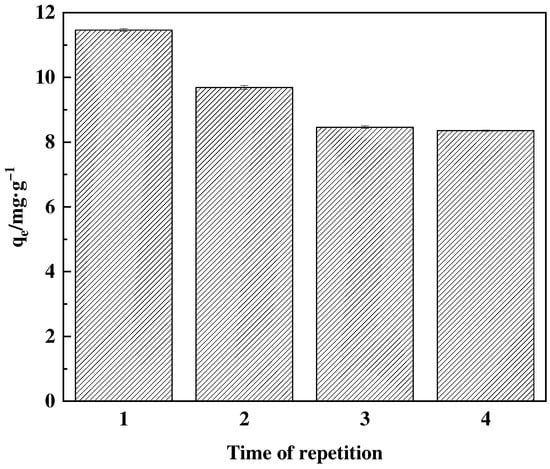 Initially, a concentration of 1.0 g·L−1 of F-g-GMA-NMDG was introduced into a solution containing 200 mg·L−1 of boric acid. The mixture was then placed in a constant temperature oscillating chamber set at 25 °C and 200 r·min−1 for 2 h. After being adsorbed, the spent adsorbent was subjected to regeneration twice with a 1.0 mol·L−1 NaOH solution for 40 min each cycle, followed by a water wash to neutralize the adsorbent. The desorbed adsorbent was subsequently dried in an oven. This procedure was repeated for several adsorption cycles.