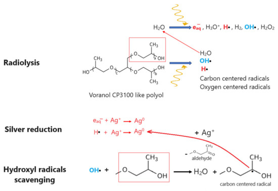 Furthermore, the radiolysis process generates hydroxyl radicals (OH●), known for their strong oxidizing properties [33]. These radicals have the potential to oxidize silver nanoparticles (AgNPs); thus, it becomes imperative to mitigate their presence in the reaction medium. Typically, primary or secondary alcohols are employed for this purpose, serving to neutralize and scavenge these highly reactive hydroxyl radicals [21,31,36]. In our case, the polyol matrix can directly capture hydroxyl radicals, resulting in the formation of water and a carbon-centered radical. This carbon-centered radical can then actively participate in the reduction of silver ions, leading to the formation of aldehyde-type compounds [37]. This proposed mechanism not only helps in neutralizing the oxidizing hydroxyl radicals but also contributes to the reduction process of silver ions, ultimately aiding in the synthesis of silver nanoparticles within the polyol solution.