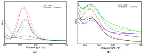 UV–vis spectra recorded on: (a) polyol/AgNPs and (b) PUF/AgNPs: V1—blue, V2—red, V3—black, and V4—green.