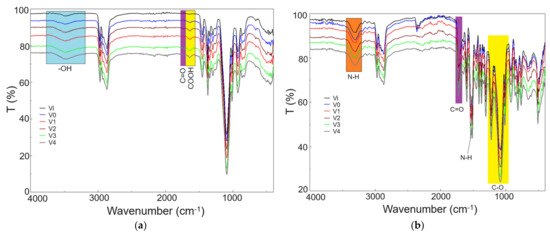 FTIR analysis was employed to observe structural modifications resulting from both irradiation and the introduction of silver nanoparticles into the foam structure. The FTIR spectra recorded on polyol and polyurethane foam samples are presented in Figure 4a and Figure 4b, respectively. In the case of polyol samples (Figure 4a), the FTIR spectra exhibit slight changes in regions corresponding to hydroxyl groups (-OH, 3300–3500 cm−1), carbonyl (C=O, 1710–1730 cm−1), and carboxyl (COOH, 1500–1700 cm−1) [36,45], with their intensity increasing from V0 to V4. However, comparing sample V0 (50 kGy, without AgNPs) to sample V1 (50 kGy, with AgNPs), the spectra are similar, except for the disappearance of the peak at 1723 cm−1 (C=O) in sample V1, possibly due to AgNPs attachment. The FTIR spectra recorded on PUF foams (Figure 4b) exhibit characteristic bands of polyurethane foams [46,47], including N-H (3210–3430 cm−1), C=O (1670–1760 cm−1), and C-O (980–1260 cm−1). Assessing the influence of AgNPs and polyol irradiation on the chemical structure of PUF via FTIR analysis is challenging due to the complex spectrum structure and the overlapping bands specific to AgNPs interaction with the polyurethane matrix.