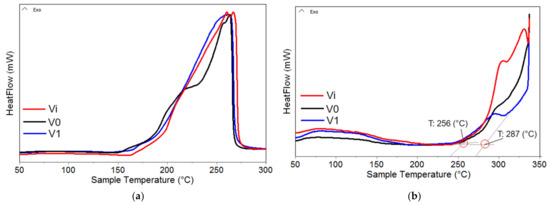 Analysis of the DSC data reveals several key observations: (i) Polyols exhibit significantly lower oxidation stability compared to their corresponding foams; (ii) the irradiation process induces a slight decrease in onset oxidation temperature (OOT) values (observed in Vi vs. V0), attributed to the generation of radio-induced free radicals that, in combination with oxygen, form various oxidation intermediate compounds, initiating a chain reaction until the deactivation of these radicals through recombination reactions or interaction with antioxidant compounds [48,49]; (iii) the presence of AgNPs appears to exert an antioxidant effect, potentially due to their electronic properties, which deactivate some of the free radicals generated during irradiation, resulting in OOT values (especially in polyols) close to those of non-irradiated samples [50]; and (iv) DSC oxidation curves of polyurethane foams exhibit a two-stage structure, indicating an initial oxidation process (OOT1) followed by a thermal combustion/decomposition process (OOT2) of the samples at high temperatures. These insights provide valuable understanding of the oxidative behavior and stability of the materials, facilitating optimization and improvement for various applications.