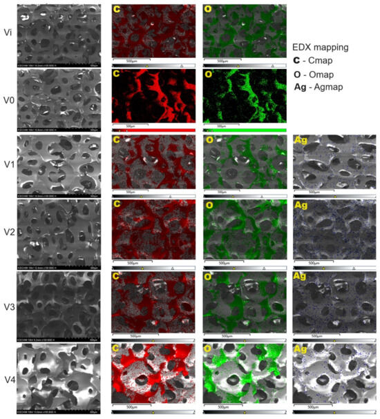 The morphostructural characterization of PUF/AgNPs samples was performed using SEM-EDX analysis (Figure 6). Overall, the SEM analysis indicates that there are generally no significant structural differences between PUF/AgNPs foams (V1, V2, and V3) and those without Ag (Vi and V0), with all polyurethane foams presenting an open cell structure with a cell window ranging between 50–150 µm [51,52]. The average size of open cells appears to decrease upon the inclusion of silver nanoparticles. As underlined by studies in the literature [53], the addition of fillers can lead to visible damages of the cell structure as well as to the induction of non-uniformity in cell morphology. However, in the case of sample V4, the formation of distinct crystalline deposits on the sample’s outer surface is observed. These deposits are likely sodium dodecyl sulfate (SDS) that has migrated and crystallized. This phenomenon could be potentially attributed to incompatibility between SDS and the polyurethane foam matrix.