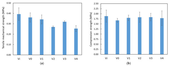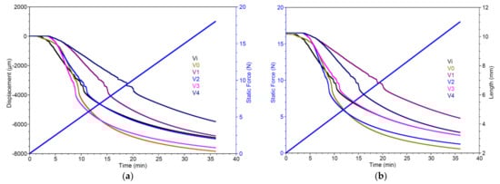 In the DMA displacement vs. time graphs (Figure 8), sample V1 displays a notably higher level of hardness compared to samples Vi and V0, which is evident from the deformation measurements of 1682 µm (V1), 3387 µm (Vi), and 4307 µm (V0) under a 5 N force. Additionally, sample V3 behaves similarly to V0, exhibiting a minor increase in stiffness when subjected to forces exceeding 4 N. Notably, samples V1, V2, and V4 demonstrate zero deformation when forces up to 2.5 N are applied. Under higher forces (10–18 N), a decelerated deformation is apparent for V4, followed by sample V1, which exhibits marginally greater deformation than the reference sample Vi.