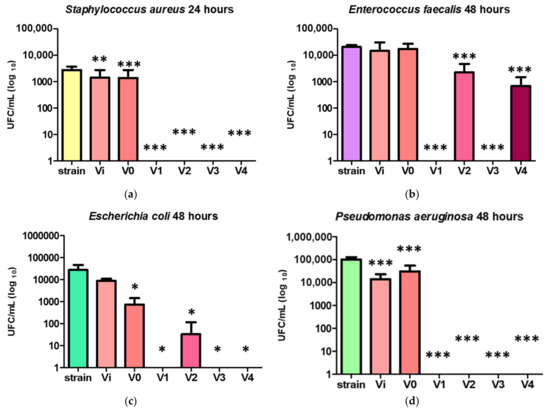 Determination of the PUF samples’ influence on bacterial viability was performed after the samples (previously sterilized by UV exposure for 30 min on each side) were put in contact with microbial suspensions in liquid medium. After different time intervals (6 h, 24 h, and 48 h), the microbial viability was established by making serial dilutions and seeding on agar medium in order to calculate the number of colony-forming units (CFU).