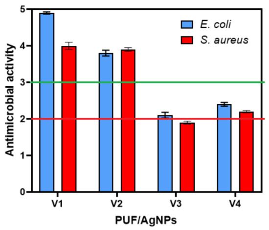 One of the most common methods for characterizing the quantitative antimicrobial effect of textile materials, including PUF, is the absorption method, which is presented in the JIS L1902:2015 standard [28]. This method is globally recognized and involves the assessment of the reduction of microorganisms compared to their initial concentrations and control samples (PUF without Ag NPs). The quantitative evaluation of polyurethane foam materials in this study was conducted after an incubation time of 24 h.