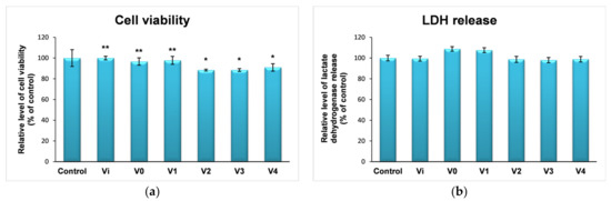 The destruction of the cell membrane leads to the release of intracellular lactate dehydrogenase (LDH) into the culture medium, which can be quantified by a series of coupled reactions that ultimately lead to reduction of a tetrazolium salt to a red formazan, which can be measured spectrophotometrically. The LDH amount released in culture medium was determined as a measure of cell membrane integrity and cell viability using a commercial kit (Cytotoxicity Detection Kit-LDH, Roche, Basel, Switzerland). Briefly, volumes of 50 μL of culture supernatants were incubated with a 50 μL assay reagent for 30 min in dark. The absorbance was then measured at 490 nm using a FlexStation 3 microplate reader (Molecular Devices, San Jose, CA, USA).